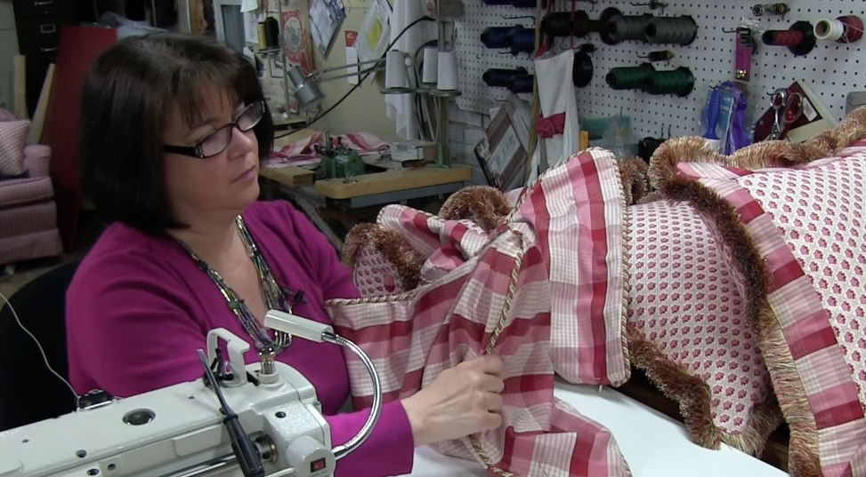 As 2014 began to wind down, I began feeling like I needed a break from the usual grind of upholstering and creating upholstery video tutorials for my upcoming upholstery class membership site. Lucky for me, I got to bring 2014 to a close by creating 12 beautiful pillows for one of my longtime clients. What a nice break from pulling fabric and shooting staples. In my opinion, you can never have too many pillows; my husband, Bill, might disagree! Pillows are a great way to add your favorite color to a room without making a long-term commitment. For example, if you choose to upholster a large piece of furniture in a bright red or orange fabric, you are committing to that color for several years. On the other hand, if you keep your larger, more expensive pieces in a neutral color palette, you can change the feel of your room by adding some bold-colored pillows. Adding details to your pillows using different trims and combining fabrics can really help to show your decorating style and personality.