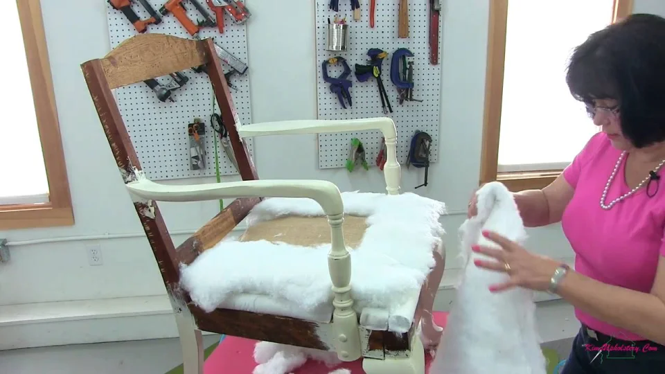 Once Bill has the springs covered with Burlap and attaches the edge roll, Kim will begin padding the chair using synthetic upholstery cotton and Dacron. We will begin upholstering the seat, followed by the inside back and outside back.