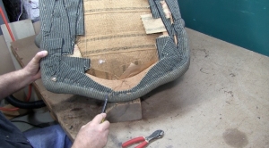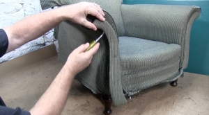 Now it’s time to finish up removing fabric from the opposite arm. Once all the fabric has been released from the two sides and the back it’s time to start on the front of the chair.